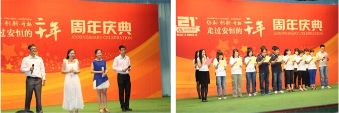 12日晚上的颁奖晚会上各地办事处展出了精心准备的表演节目,真是你方唱罢我登场好,好戏连台不冷场。有来自东北大区威风凛凛的太*表演、上海大区讲述安恒趣闻的海派清口、河南大区的*炫集体舞以及北京、山东、内蒙古等地气势高昂的大合唱,均为安恒集团21周年庆典增色无限,将庆典的气氛推向了高潮。随后的“团队乐章”汇报表演,更体现出全体安恒员工携手并进开创基业的决心。
